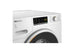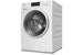 Le lave-linge Miele WWA120 WCS se distingue par son design élégant en blanc lotus avec une porte en noir obsidien et une bague blanche.