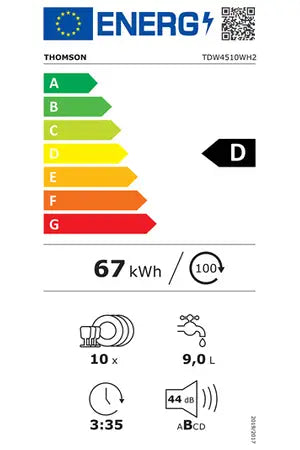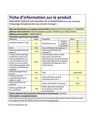 Les points forts Largeur 45 cm (10 couverts) - 44 dB - Classe énergétique D Consommation d'eau 9 L/cycle (HxLxP) : 84.5 x 45 x 60 cm Départ différé - Programme Eco Description Ce lave-vaisselle THOMSON...Prix normal 339,99 €Prix normal 339,99 €