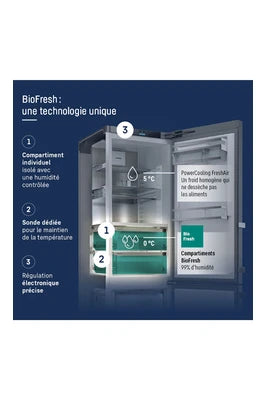 Les points forts Volume Total 664 L - Dim.: (H-L-P) 185.5x120x67.5 cm - Classe C - 34 dB Réfrigérateur à froid brassé PowerCooling FreshAir 458 L Congélateur à dégivrage automatique NoFrost 206 L Technologie Blu Performance...Prix normal 2.999,00 €Prix normal 2.999,00 € -