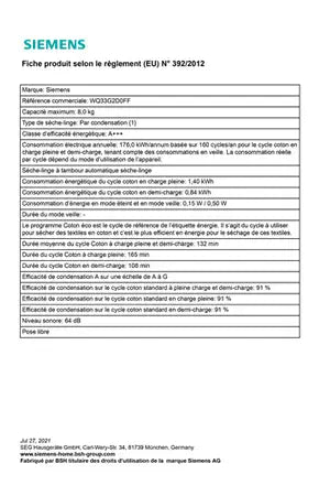 Description Ce sèche-linge frontal Siemens WQ33G2D0FF blanc, porte en verre cadre blanc argent, dispose d'une capacité de 8 kg est doté d'une pompe à chaleur A+++ ! Résultat : une dépense d'énergie limitée, un temps de séchage constant et un résultat...Prix normal 839,99 €Prix normal 839,99 € -