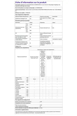 - 147 bouteilles - Dimensions (H-L-P) 167.4 x 54 x 60 cm - Classe E - 39 db
