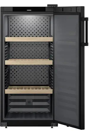 La cave Liebherr WKP142 est une cave de vieillissement dotée d'une porte pleine pour une parfaite maturation lente à l'abri de la lumière extérieure et une finition noire qui lui confèrent un design élégant. Elle a une capacité de 141 bouteilles.