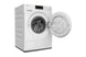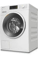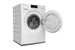 Le lave-linge Miele WWA120 WCS se distingue par son design élégant en blanc lotus avec une porte en noir obsidien et une bague blanche.