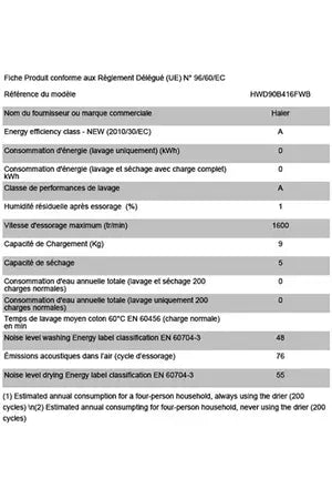 Le lave-linge séchant Haier HWD90B416FWB-FR, est doté d'une grande capacité de 9 kg en lavage, 6 kg en séchage, idéal pour une famille nombreuse. Ce lave-linge séchant est équipé d'un Moteur Inverter : plus silencieux, plus économe, plus fiable. Il bénéficie d'une classe énergétique A.