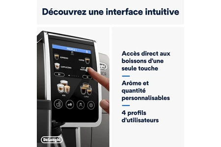 Le nouveau panneau de commande avec écran couleur tactile TFT 3,5″ rend l'utilisation encore plus intuitive. Grâce à la technologie “Smart One Touch”, les boissons les plus utilisées sont toujours disponibles sur la page d'accueil, simplifiant ainsi la sélection.