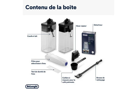 • 2 carafes à lait, filtre adoucisseur d'eau, cuillère doseuse, test de dureté de l'eau