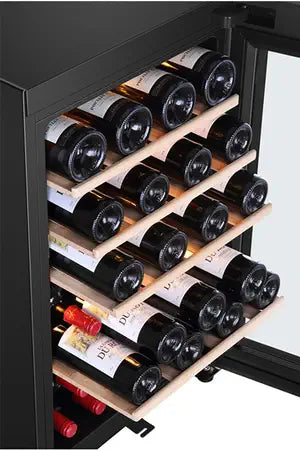 5 clayettes en bois, semi coulissantes accueilleront différents types de bouteilles. La capacité de stockage maximale est de 49 bouteilles de types Bordelaises légères rangées tête-bêche.