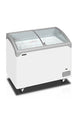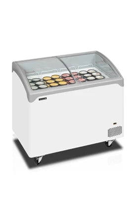 Congélateur coffre de Crème Glacée élégant avec couvercles coulissants vitrés bombés Mesures et contenu : Plage de température : -24 à -14 °CClasse climatique : 5Poids brut / net : 70 / 62 kgVolume brut / net : 286 / 218 lDesign et matériaux : Nombre et type de couvercles : 2 couvercles coulissants vitrés incurvésNombre et type de paniers : 4 Panier métallique, blancVitrage de sécurité : OuiRoulettes : 4 roulettes, 2 avec freinFinition extérieure : BlancFinition intérieure : Acier peint en blancSerrure : OuiFroid et fonctions : Type de régulation : MécaniqueType de réfrigération : StatiqueType de dégivrage : ManuelFluide frigorigène : R290Charge de gaz : 85 gPuissance et consommation : Classe énergétique : DConsommation d'énergie : 1.99 kWh/24hConsommation énergétique annuelle : 724.53 kWh/anIndice d'efficacité énergétique : 48.8Volume EEI : 209 lPuissance consommée : 119 WTension / Fréquence : 220-240/50 V/HzNiveau sonore : 45 db(A)Thermomètre : OuiDimensions : Dimensions intérieures (LxPxH) : 890 x 510 x 571 mmDimensions extérieures (LxPxH) : 1030 x 650 x 918 mmDimensions emballées (LxPxH) : 1100 x 765 x 990 mmCharge conteneur 40 pieds : 64 pces